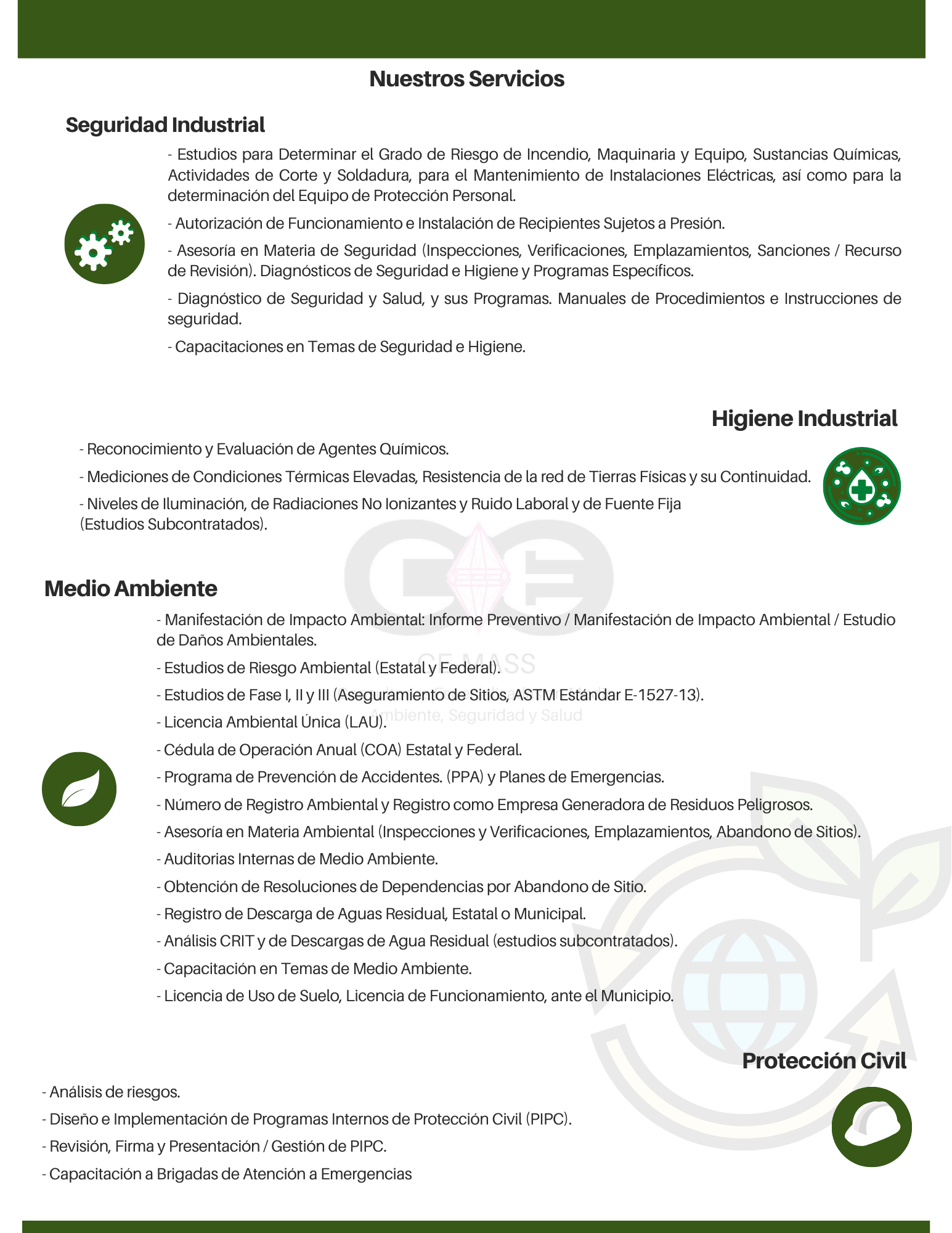 Realizamos estudios de medio ambiente, seguridad e higiene industrial, salud ocupacional, protección civil, capacitaciones con valor curricular. Todo lo correspondiente en materia ambiental requerido por las autoridades competentes.
